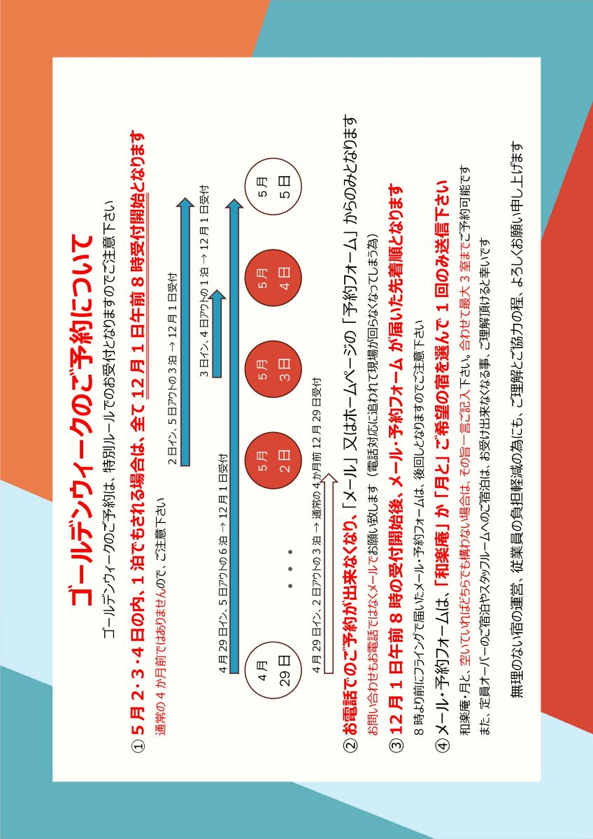 ご予約の開始時期についてゲストハウス和楽庵では、4ヶ月前の日付の午前0時(日本時間)からご予約をお受付しております(例:11月25日は7月25日午前0時受付開始)
